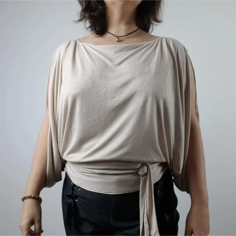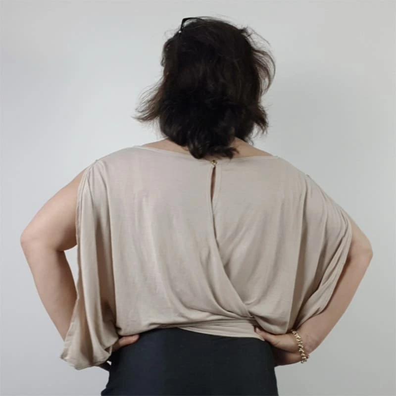 Ce patron est un haut drapé sur les côtés et croisé dans le dos. Il se ferme avec un petit bouton boule et une bride. La ceinture plaquée devant, s’entre croise sur les côtés pour se nouer sur le devant à la manière d’un cache-cœur. Vous avez l’option de fermer la manche avec un point permettant d’obtenir un effet manches ouvertes. Retrouvez toutes les explications de montage en photos et illustrations sur le livret de montage téléchargeable avec le patron.